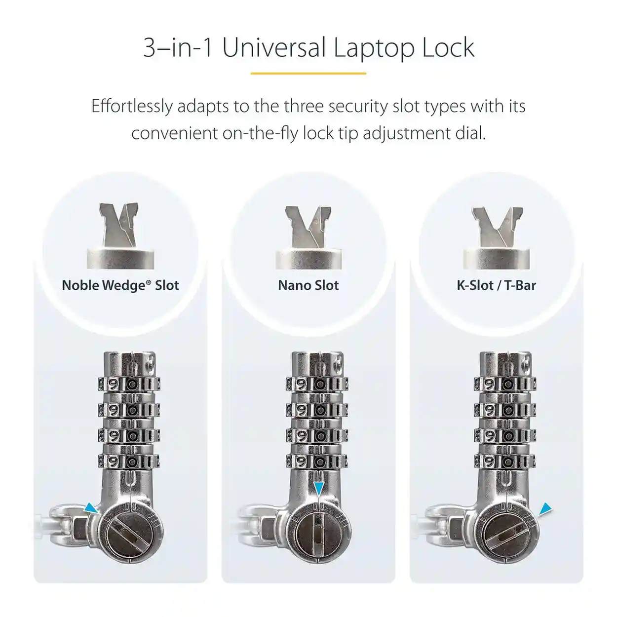 - UNIVERSAL 3-IN-1 LAPTOP LOCK: Compatible with Noble Wedge®, K-Slot (T-Bar), and Nano lock slots using an adjustable lock tip; 6.6ft (2m) and 0.17in (4.4mm) thick cut-resistant carbon steel cable; Lock can withstand a pull force of up to 202lb (91.6kg)