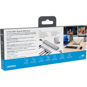The USB-C Dual HDMI Monitor 12-Port Docking Station is a versatile hub that expands a single USB-C port into a full workstation solution. With support for dual 4K UHD displays, fast data transfer, wired networking, peripheral connectivity, and laptop charging, it transforms laptops and Chromebooks into productive desktop setups.