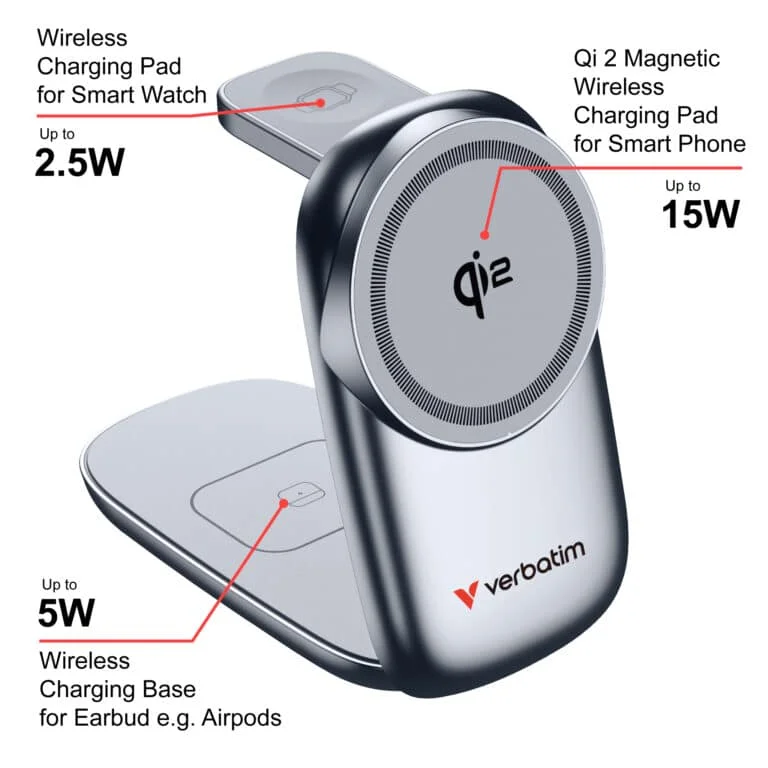 Verbatim 3 in 1 Wireless Docking Qi2 Certified, Magnetic Wireless Charging. 2.5W/5W/15W