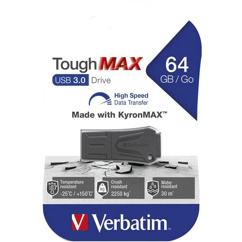 The Verbatim ToughMAX USB Drive is made with KyronMAXcompounds, a metal replacement thermoplastic material which is able to withstand seriously punishing conditions and has been used in the most demanding of applications from fighter jets to mountain bikes.