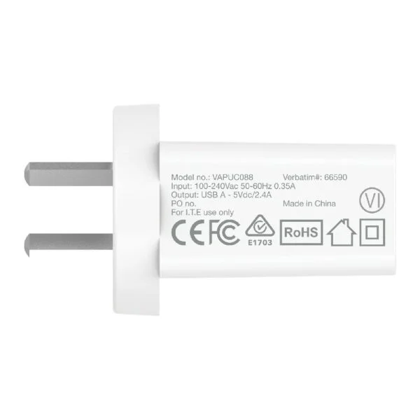 Stay charged and connected with the Verbatim Single Port 2.4A USB Charger – your go-to power solution for everyday charging needs! Charge your devices faster with up to 2.4A charging capability. The white design lets this charger look at home in a modern desktop setup. Compliant with Australia/New Zealand Electrical Safety Standards providing peace of mind that it will work as expected and not damage your devices.