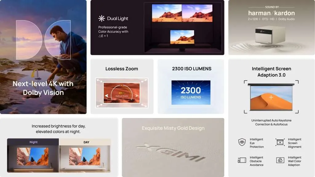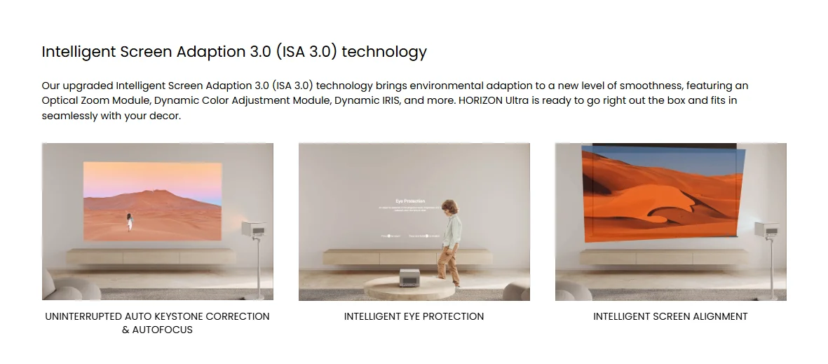 Intelligent Screen Adaption 3.0: Our upgraded ISA technology smoothly optimizes projector environmental adaptability, easy usage, wall color adjustment, optical zoom, and other ISA features like never before!