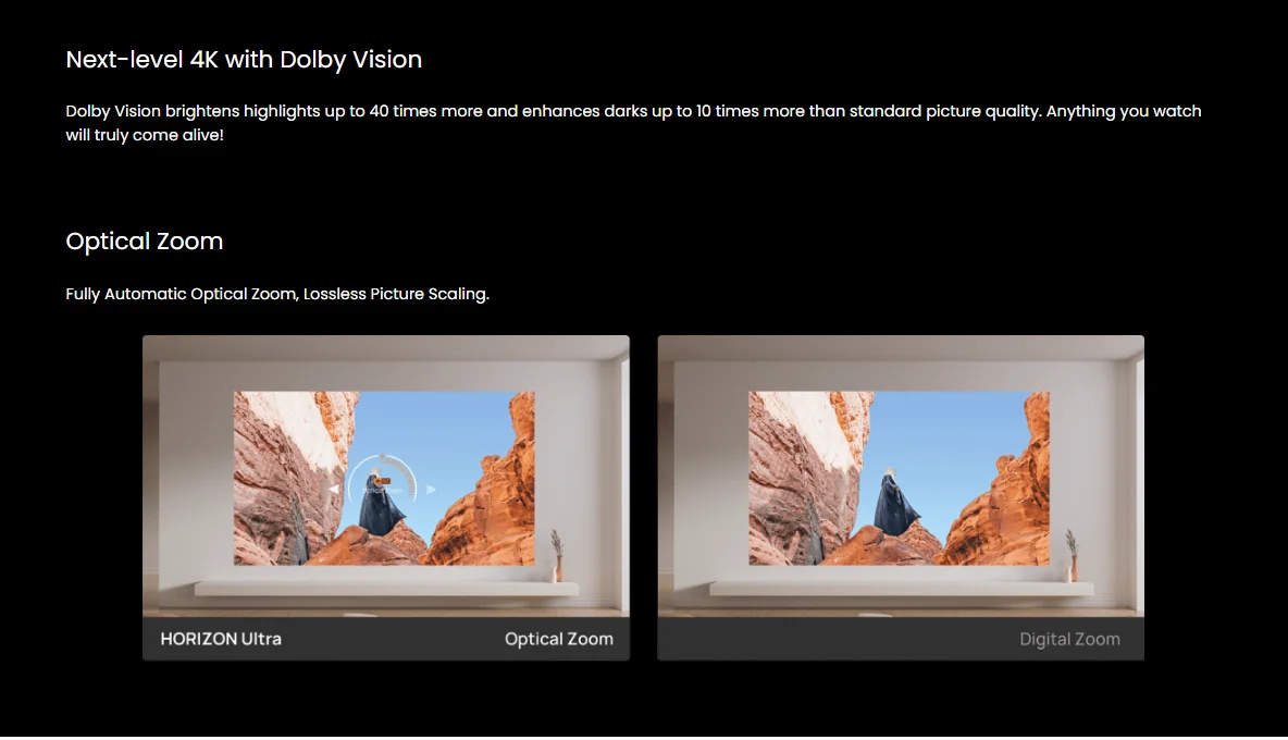 Dual Light Technology: Pairing LED and Laser technology, HORIZON Ultra delivers the ultimate color accuracy, brightness, and color gamut for a visual experience you’ll never forget.